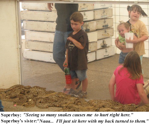 Okeene is located in northeastern Blaine County, 40 miles southwest of Enid and 17 miles north of Watonga. For more than 60 years, Okeene has held an annual Rattlesnake Hunt. On the first weekend in May every year, there is a three day rattlesnake hunt and festival. The snakes are hunted in and around the gypsum hills near Southard, between Watonga and Okeene. It's a big deal for the folks of Okeene. Rattlesnakes are hunted, handled, displayed, and butchered. Rattlesnake steaks are served by street venders. Contrary to what you may have heard, rattlesnake steaks don't taste like chicken. They taste like rattlesnake steaks. Here are a few photos of the 2007 Rattle Snake Hunt which I attended. I am a non-rattlesnake handler. But I am a pro-rattlesnake photographer. Enjoy... Click on thumbnails... |